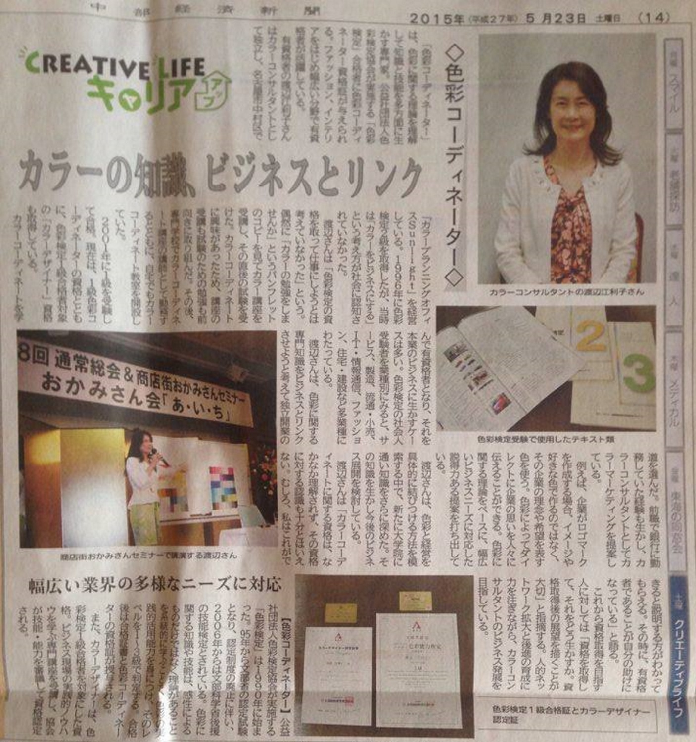 現在渡辺は、一般向けにカラーコミュニケーションに関するものを、企業様向けにカラーマーケティング(ブランディング・色彩戦略)に関するものをご提案させて頂いております。